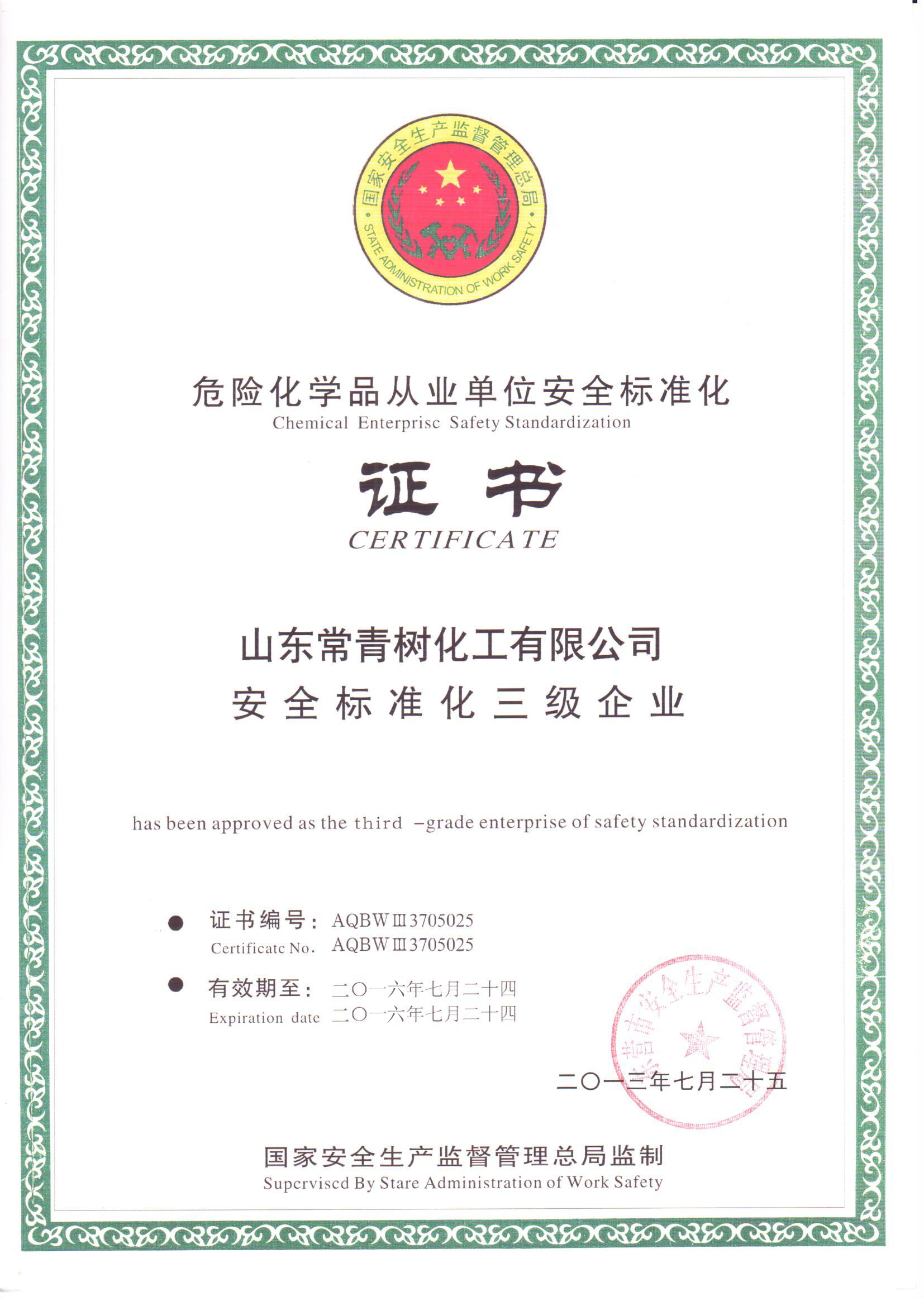 2013年,安全标准化三级企业达标证书